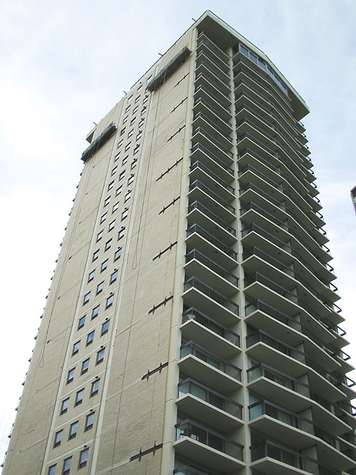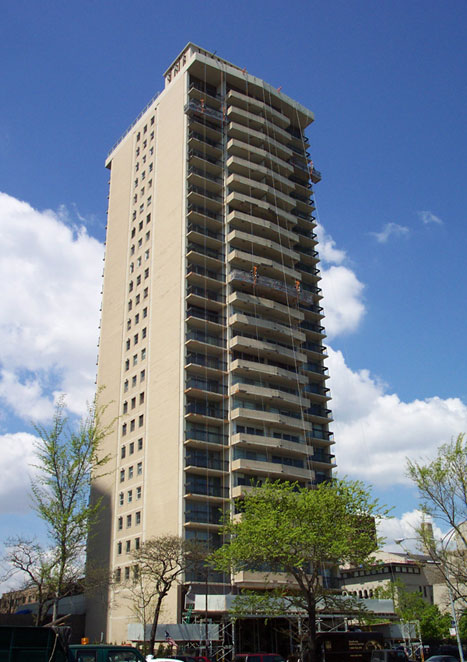 Balcony handrails accentuate the striking horizontal lines in this north side high-rise. When the steel handrails required maintenance, DIS was called in to complete a comprehensive project of concrete and balcony restoration. This multi-phased project includes handrail repair and painting, along with related concrete repair and deck coating. Work also included repairing deteriorated concrete in other areas of the façade, removal and replacement of brick and steel shelf angles as needed, and tuckpointing. Painting and sealing exterior surfaces will complete the restoration.