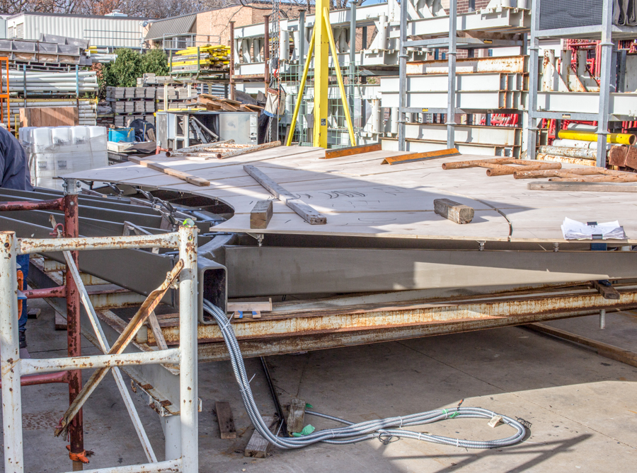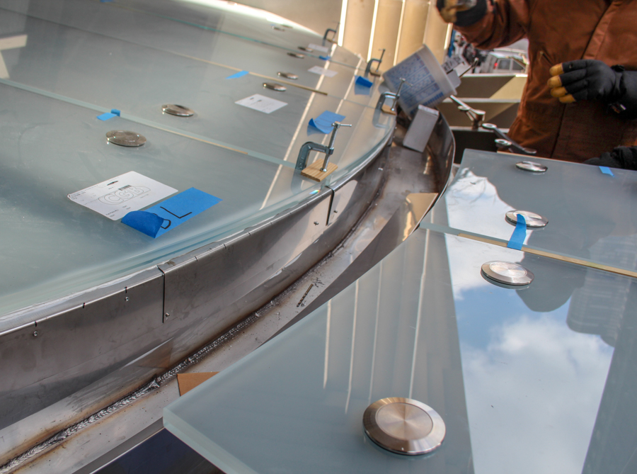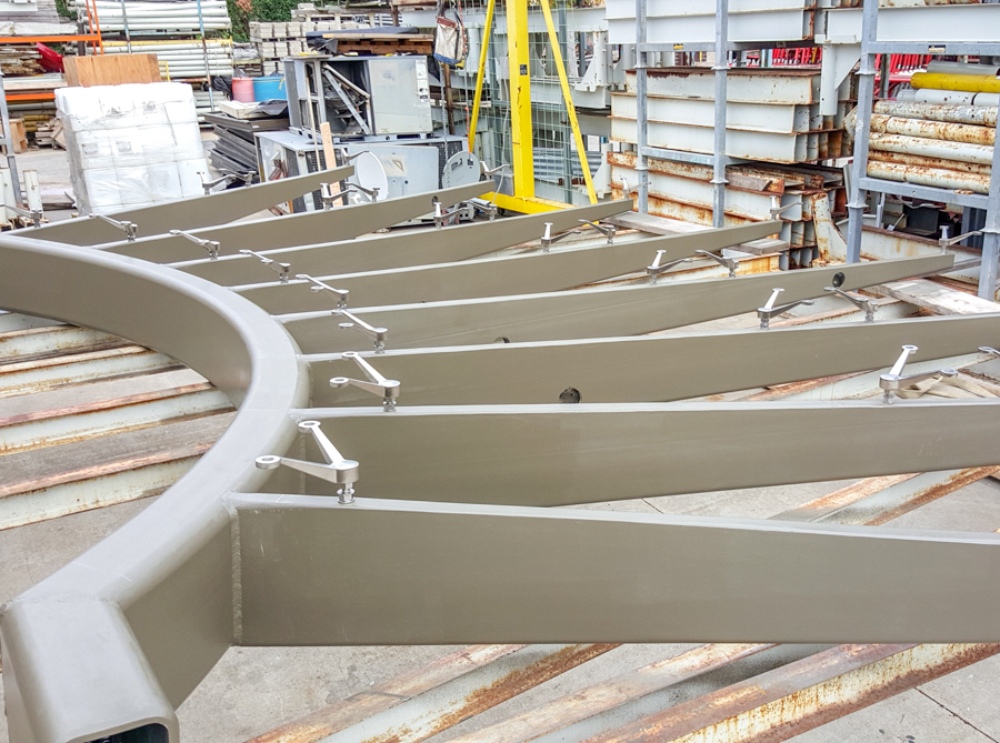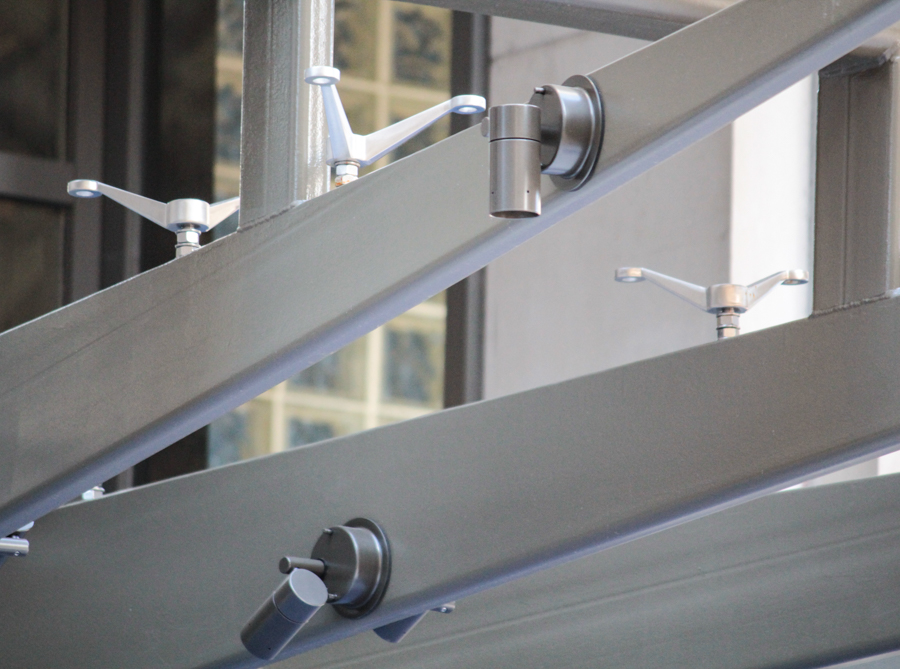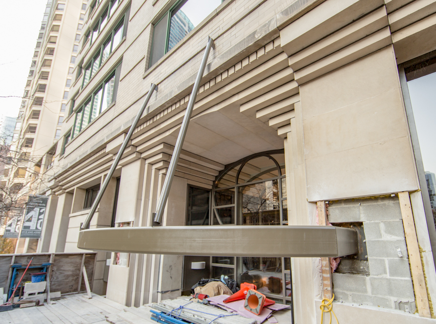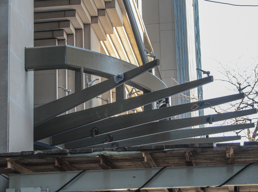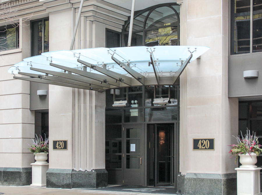 DIS was called upon to both fabricate and install a custom entrance canopy at 420 E. Ohio. This project truly showcased our steel fabrication capabilities. The canopy design consisted of large steel spoke projecting from the building with specialty glass installed above mounted with custom stand offs. Once completed, the building was pleased with the design, delivery, and installation of this beautiful entrance show piece.