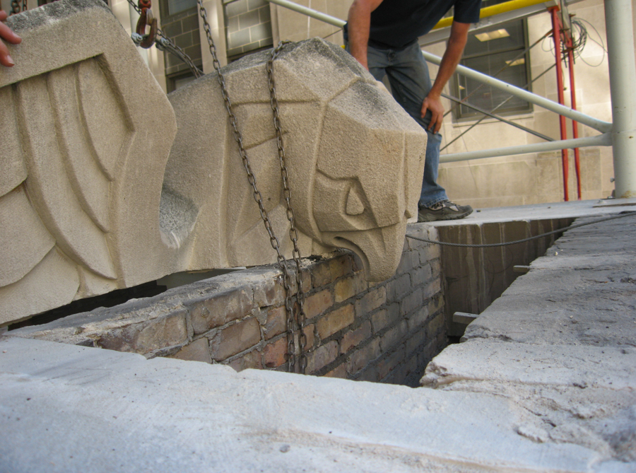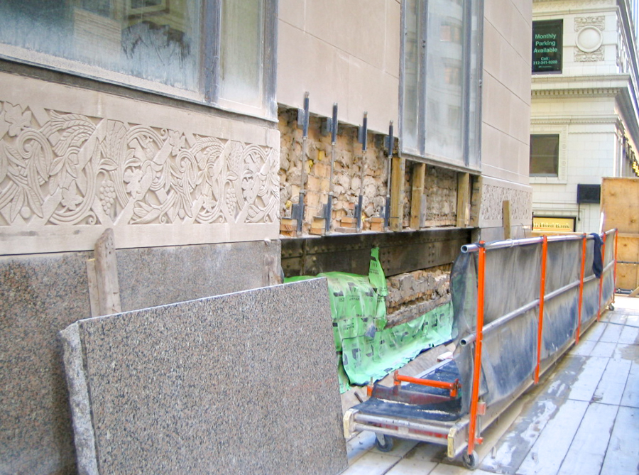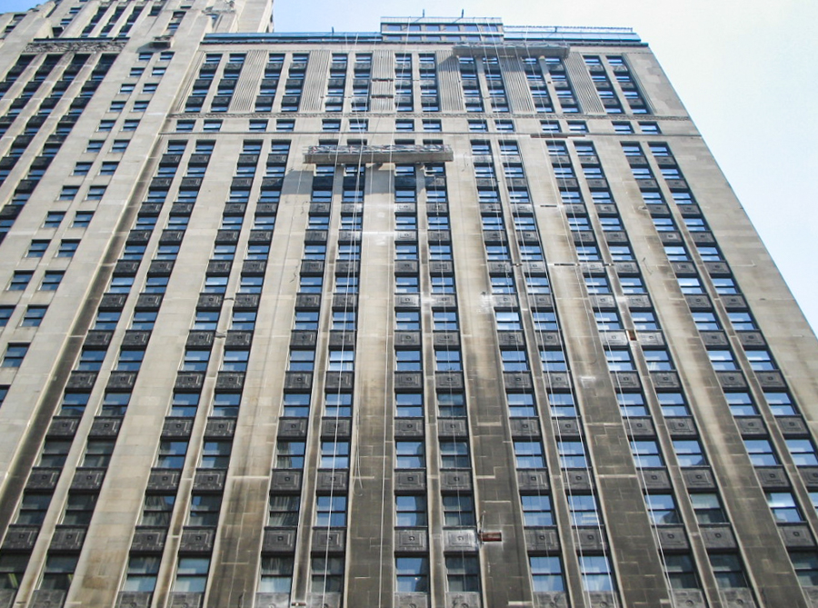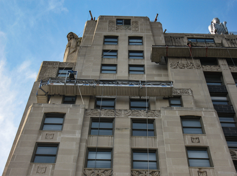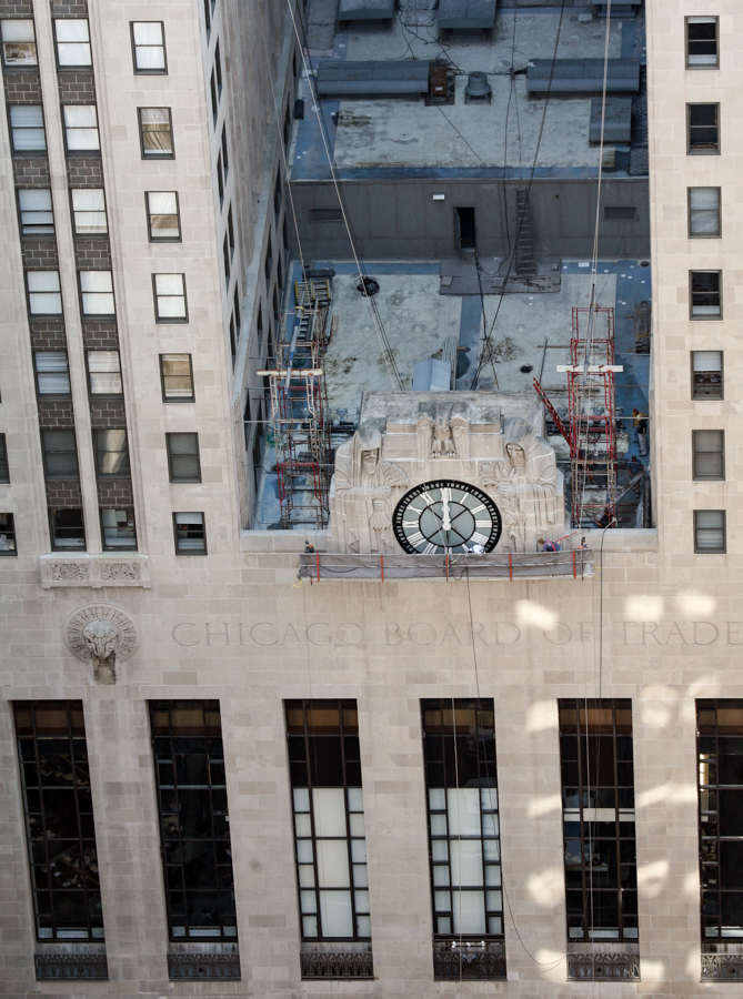 The Chicago Board of Trade undertook a major restoration project as part of its 75 year anniversary celebration. Design Installation Systems was chosen as the historical restoration contractor for the work on the exterior facades. In addition to stone repairs and replacements, DIS completed tuckpointing, caulking and cleaning of all of the limestone and terra cotta on the building. All work was documented and approved by a certified historic restoration expert.