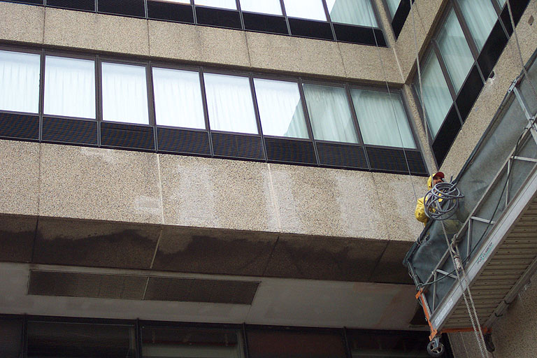 Holiday Inn Hotel, located on of the upper floors of the well known Apparel Mart, required extensive repairs to the deteriorating precast concrete panel exterior. The misplaced reinforcing bars inherent during original fabrication of the panels lead to premature failure of the exposed aggregate concrete. The nature of the exposed aggregate finish and the varied weathering of the panels were especially challenging to provide a consistent match. Through perseverance and experience, the repair specialists were able to achieve excellent results.