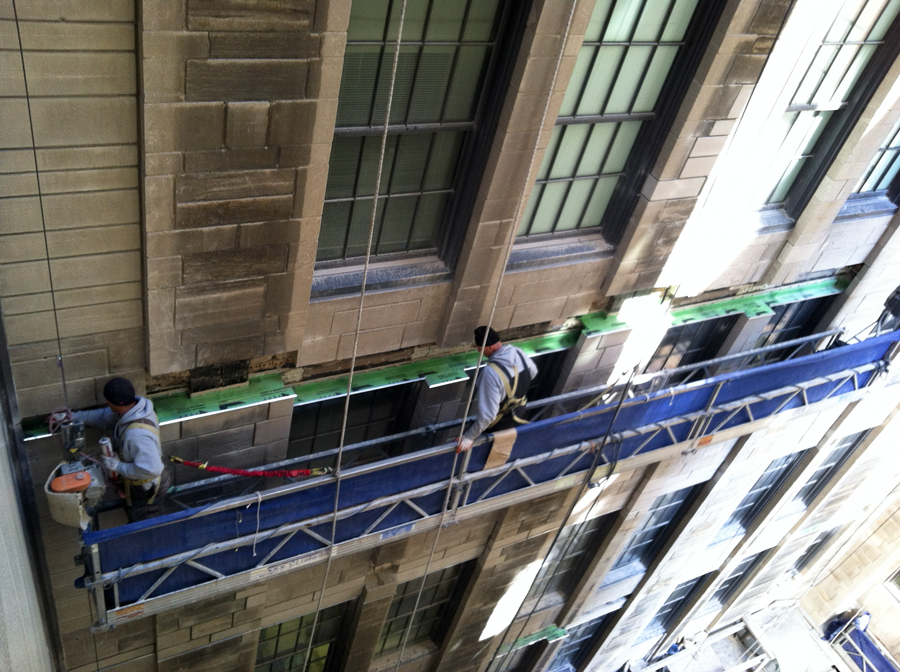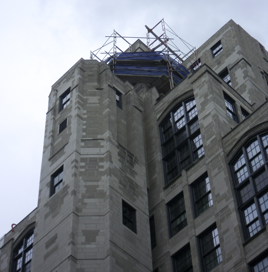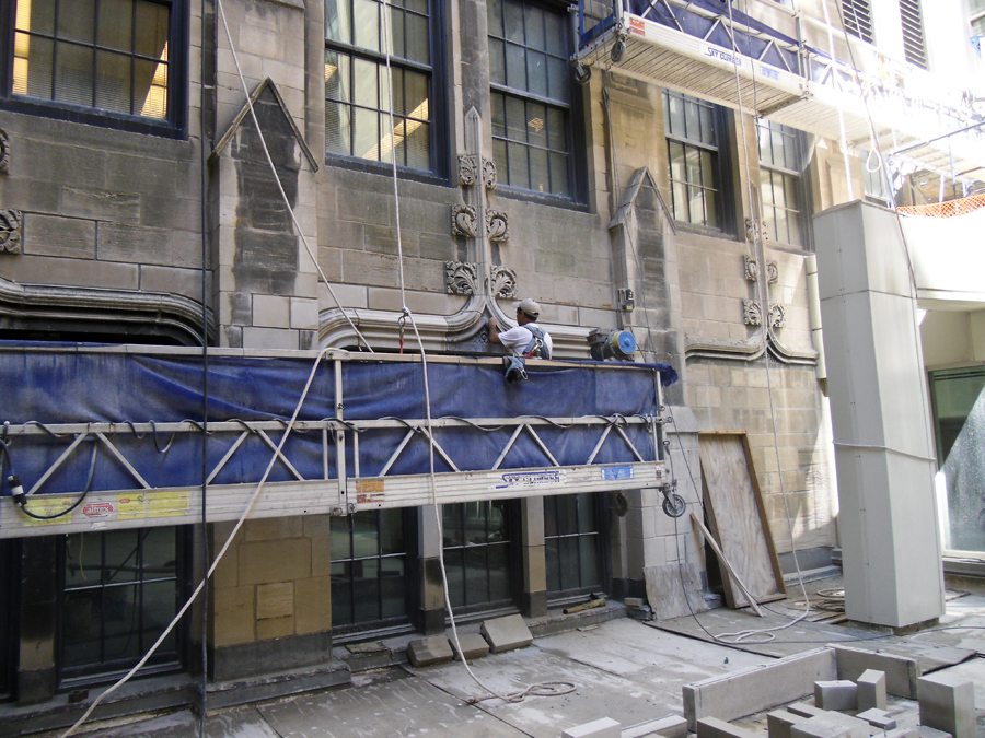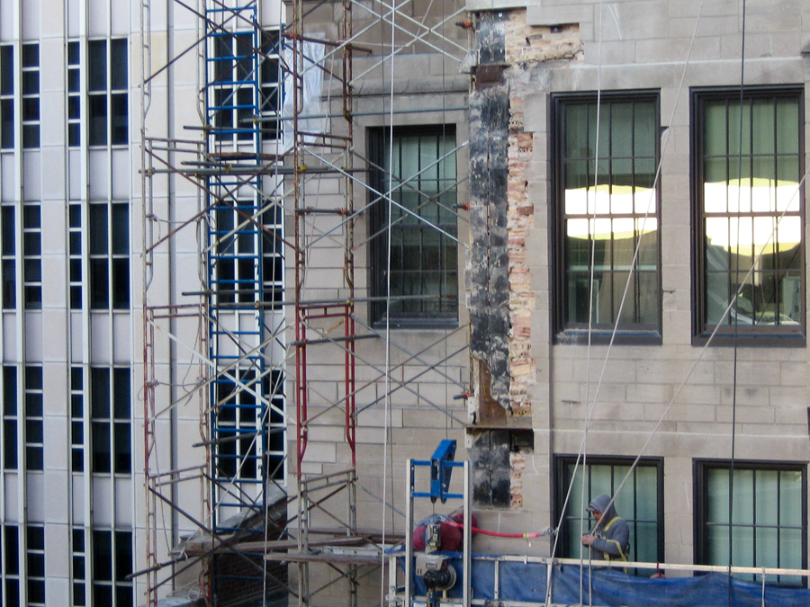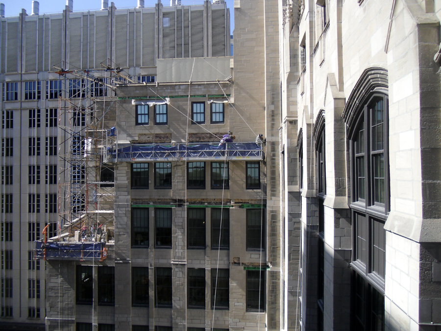 Northwestern University’s Ward Building has completed a five year façade rehabilitation with DIS. Work included removal and replacement of deteriorated or damaged limestone blocks to match the existing pieces in size and appearance. Also included was complete tuck pointing of all mortar joints, routing and sealing of limestone, replacement of steel shelf angles, repair of full depth limestone dutchman, repair of concrete behind limestone, and cleaning of the limestone facade.