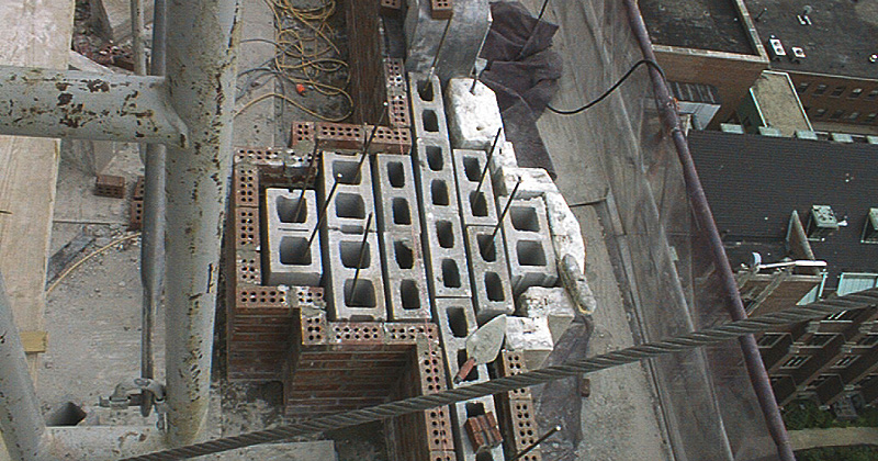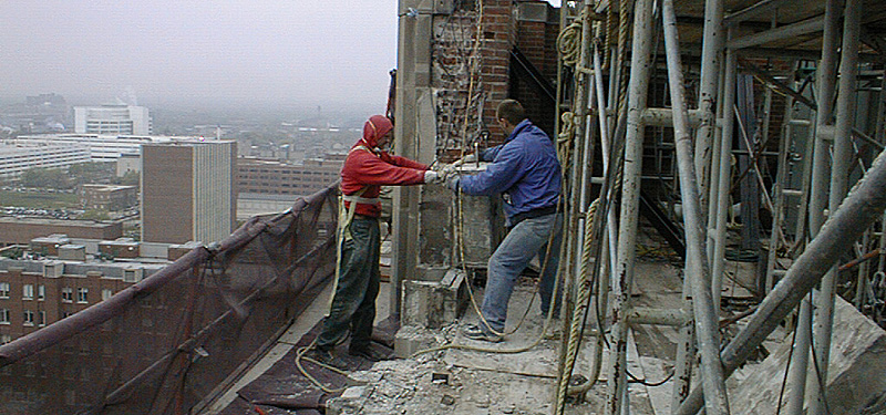 This project consisted of completely dismantling and rebuilding the ten foot high limestone and masonry parapet walls at this historic university building. As all of the decorative limestone was salvaged and reused to preserve the architectural integrity of the building, extensive surveys were performed and documented. The engineered rigging required to accommodate the height of the parapet walls and the extraordinary weight of the limestone piers added to the complexity of the project. Custom trolley systems, beams and hoists were used by the craftsman to facilitate the movement of the large, decorative stones.